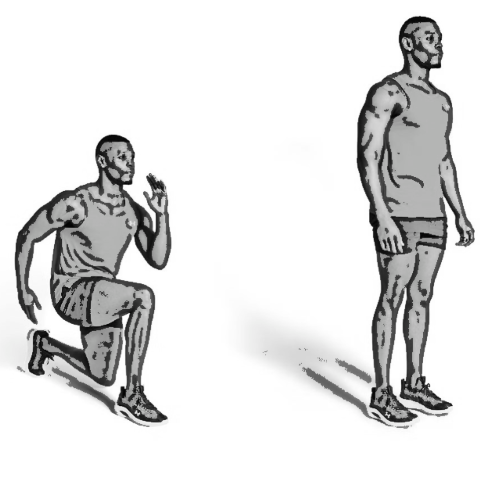 Stand tall, step forward with one leg. Lower hips until both knees form 90-degree angles. Front knee stays above ankle. Push through front heel to return. Alternate legs.