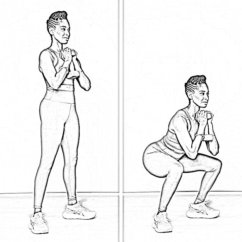 Stand with feet shoulder-width apart. Lower hips back and down as if sitting in a chair. Keep chest lifted, knees tracking over toes. Descend until thighs parallel to floor, then drive through heels to stand.